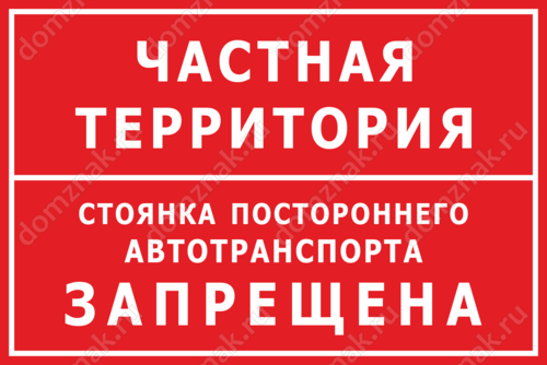 Табличка в ярко-красном цвете информирует автолюбителей о том, что территория принадлежит частному лицу, а парковка для сторонних машин запрещена. Табличка может быть изготовлена в любом цвете, кроме текстового изображения возможно нанесение знака или символики.