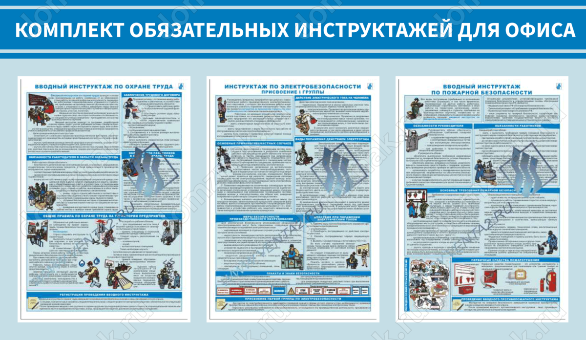 Разместите в помещении стенд «Комплект обязательных инструктажей для офиса», который содержит в себе информацию по охране труда, пожарной и электробезопасности. Все правила и требования логически разбиты на блоки и подкреплены цветными изображениями. Три вида инструктажей размещены на пластиковой поверхности стенда, без использования «карманов».