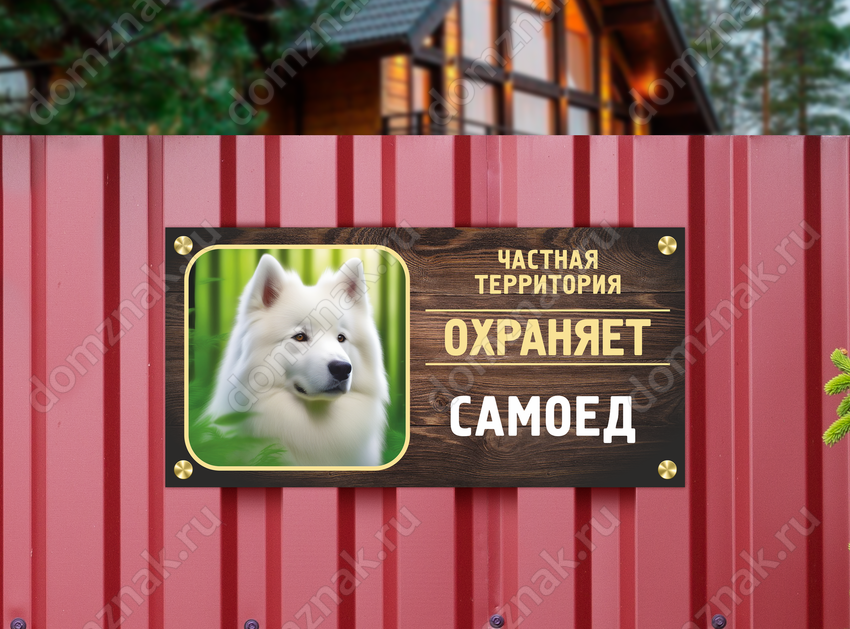 Табличка «Частная территория. Охраняет Самоед» изготавливается на основе из пластика ПВХ или оцинкованного металла.