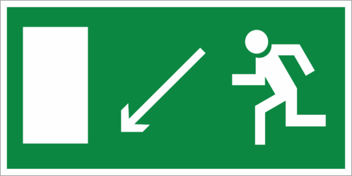 Эвакуационный указатель «Направление к эвакуационному выходу налево вниз» (код E08), устанавливается на стенах помещений для указания направления движения к эвакуационному выходу по наклонной плоскости.